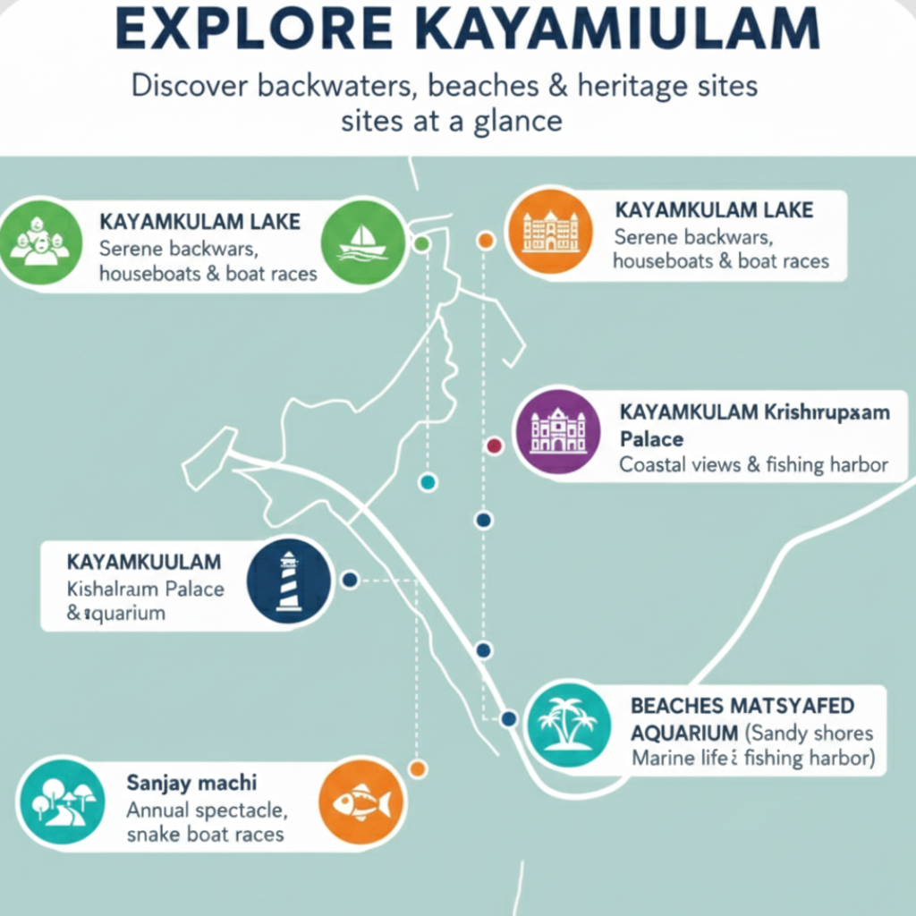 - Backwaters & Water Sports: Enjoy the serene Kayamkulam Lake with its houseboats and exciting boat races.